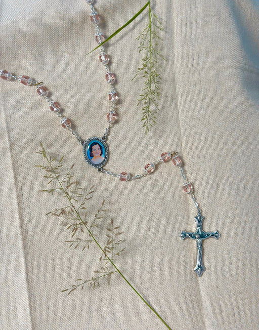 This delicate Charlene Richard Rosary features light pink faceted crystal beads that shimmer beautifully in the light, offering a soft and elegant ...