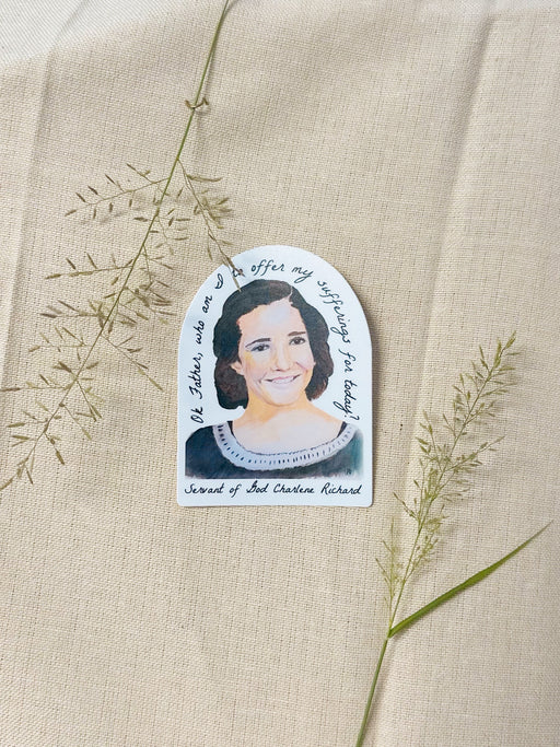 This high-quality vinyl sticker features a soft watercolor-style portrait of Servant of God Charlene Richard, accompanied by her touching quote: "O...